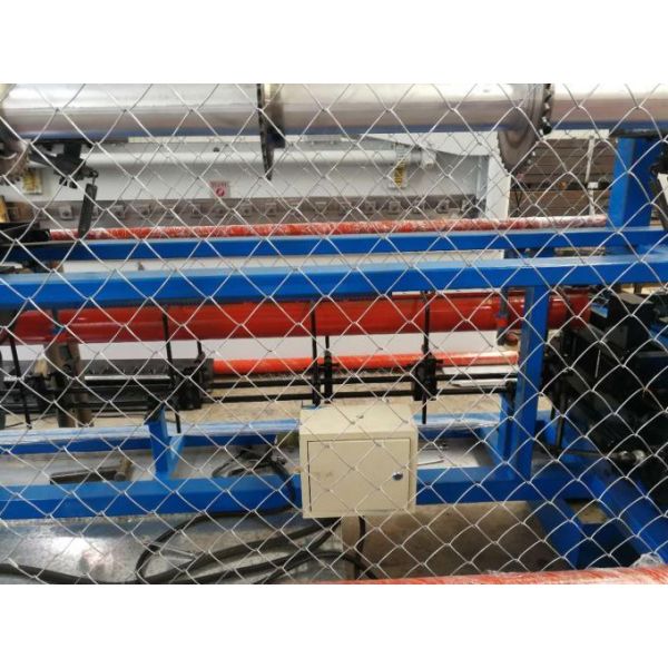 The crimped mesh making machine for manufacturing chain link fences of different sizes. The wire is taken in from the payoff stand and passed through the dies where the SIZE takes place. Different gap sizes. After passing from the die the pattern wire is automatically thrown on the winding shaft in the stitching process. Once the stitching is complete the woven is manually glided down to enable the next stitch to take place. The chain link is automatically wound to form rolls when the desired length is manufactured.