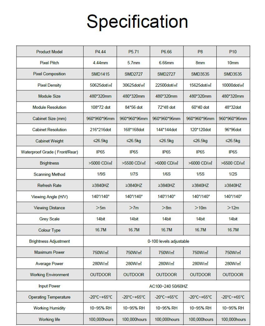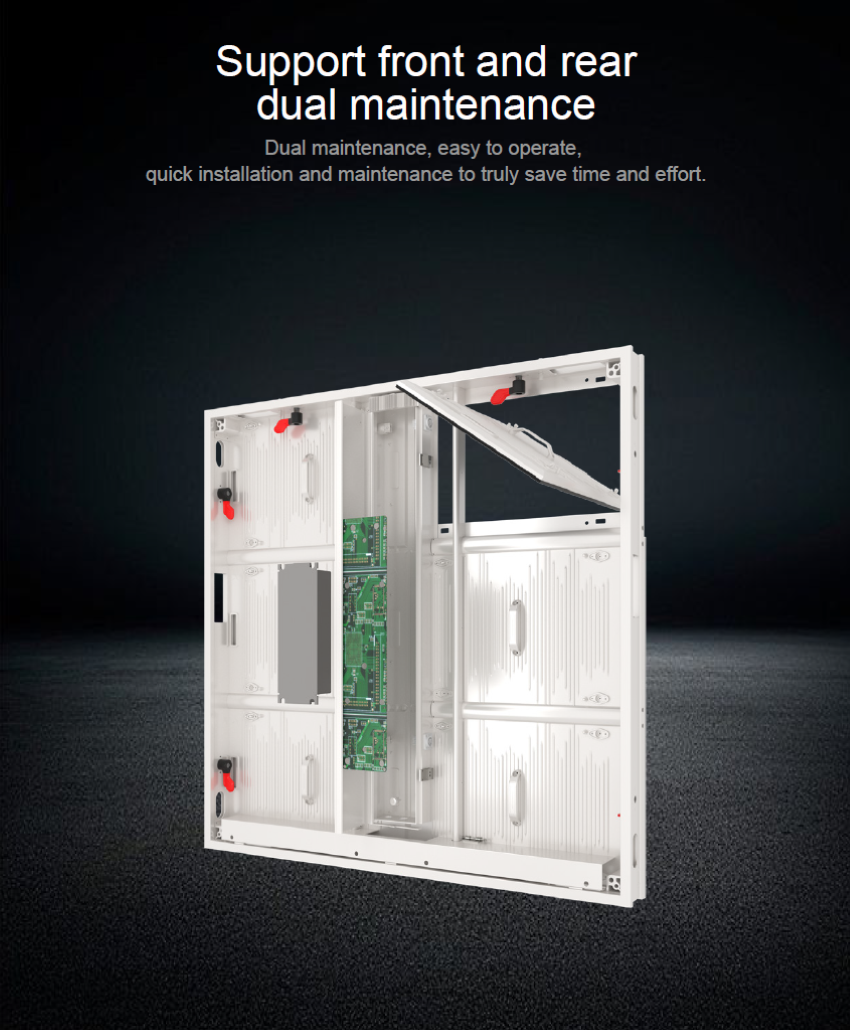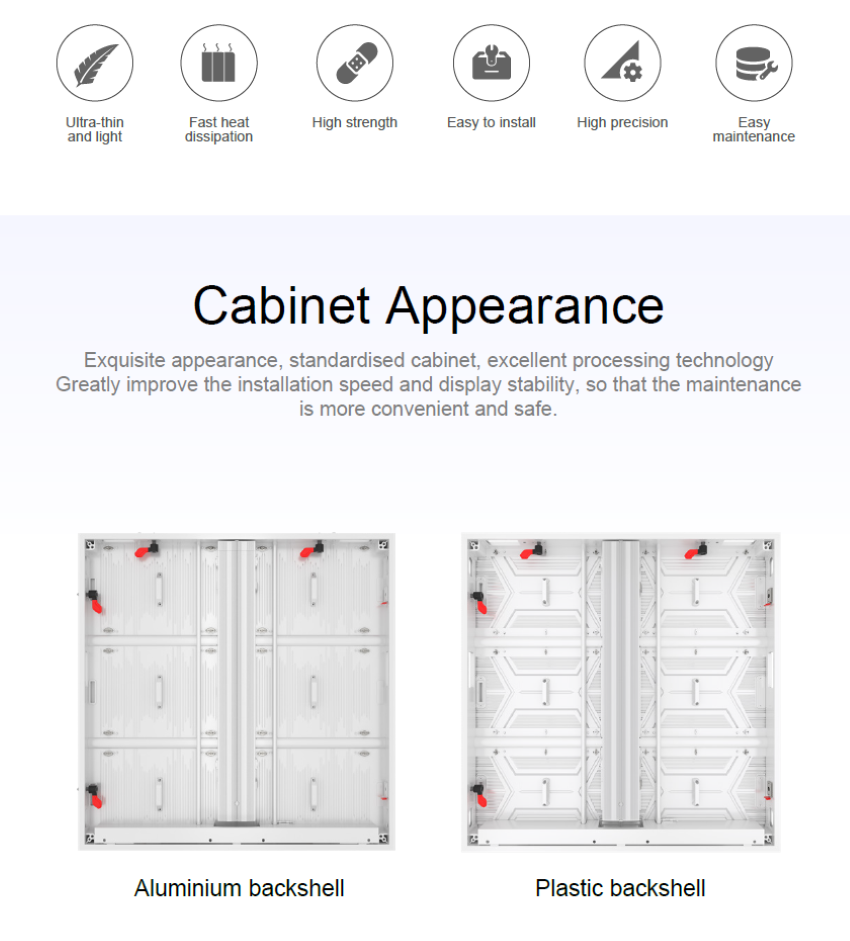 • Structural & Design Features: Adopts 480×320 standard modules with profile aluminum cabinets (exquisite appearance, standardized design, and excellent processing technology); offers two backshell options (aluminum backshell and plastic backshell); ultra-thin and lightweight, with high strength, efficient heat dissipation, and high precision.