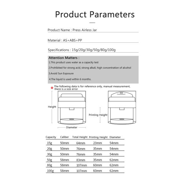 This top-dispensing vacuum jar is the "active ingredient safe" for skincare and beauty products. Powered by a vacuum piston structure, simply press the top pump to dispense product—air and bacteria