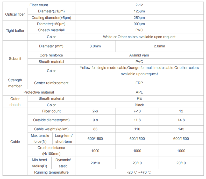 • Stranded strength member structure ensure the cable endure larger tensile strength;