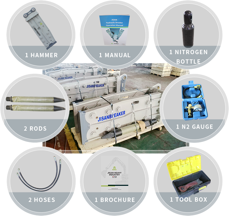 Item/Model | weight (kg) | length (mm) | pressure (bar) | flow (lpm) | rate (bmp) | hose (inch) | chisel (mm) | suit(ton) |