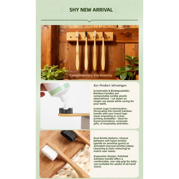 This eco-friendly bamboo toothbrush is made from natural bamboo and features soft bristles, making it biodegradable and gentle on gums. Its handle is crafted from sustainable bamboo, ensuring an environmentally responsible choice for oral care. Customizable packaging (add your logo!), bulk pricing options, and on-time delivery—we’re your trusted partner for eco-friendly amenities. Impress guests with sustainable choices while reducing plastic waste! Contact us for a quote or sample—let’s make your business more environmentally responsible together!