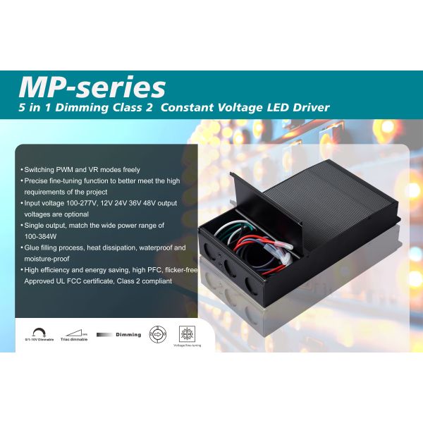 The MP- series LED drivers are UL listed and approved for single output. They offer PWM or DC voltage output modes with 5-in-1 dimming functions. The input voltage ranges from 100-277vac, 50/60hz.And certified to meet UL cUL Class P and CE safety approvals. The MLV/ELV dimmable Power Supply use low profile aluminum case with US Patent makes led dimmable driver the power solutions for LED strips, LED sign, billboard and landscape lighting. Featuring PFC function of up to 0.95 and higher, NEMA 3R environment Protection Rating for indoor or outdoor use, the MP series triac/0-10V dimmable led power transformer provide 5 years warranty and outstanding led dimming peformance.