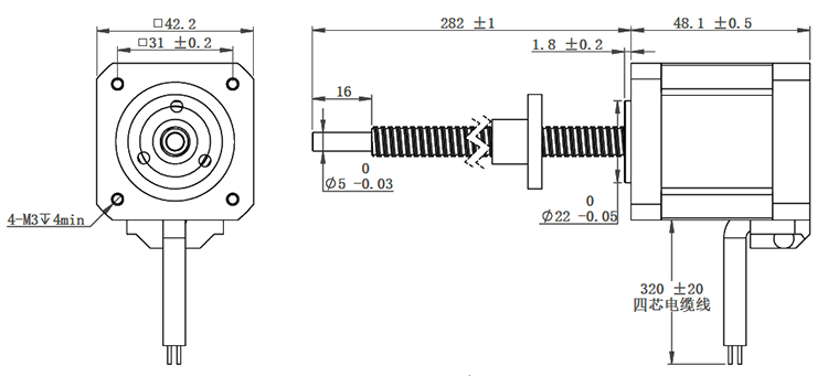 This is NEMA17 42mm size hybrid stepper motor with TR8 lead screw, and lead is 4mm.