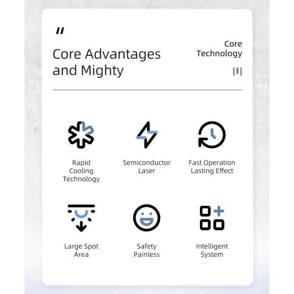 Laser of 3 different wavelengths (755nm, 808nm, 1064nm) combined penetrates epidermis to hair follicle, preferentially absorbed by melanin and converted into heat to directly crush hair roots and nutrients, depriving hair generation ability without damaging surrounding tissues, meanwhile instant strong refrigeration ensures the epidermis won’t be burned, thus achieves a rapid, painless and permanent hair removal.