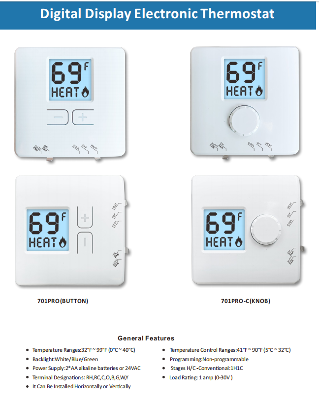 Introducing the OCSTAT 701PRO Non Programmable Thermostat, a high-quality product originating from China, designed to meet your temperature control needs with precision and reliability. Certified by CE and FCC, this thermostat ensures safety and compliance with international standards.