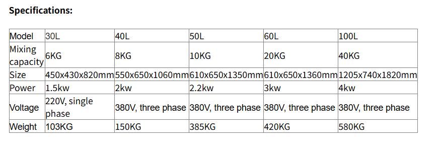 The planetary food mixer has 30L, 40L, 50L, 60L for customer to choose, it is the essential food mixing machine in food production line.