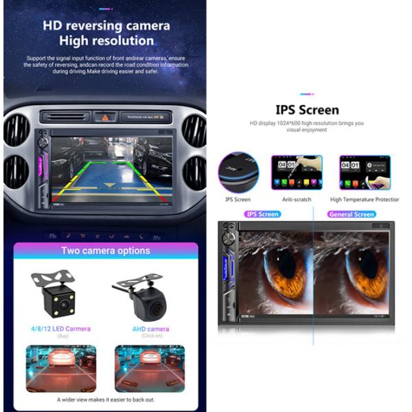【Rear Front View Camera】: The bluetooth car radio supports rear and front view camera with an automatic display of the image on the screen when in reverse. (front and rear camera is optional)