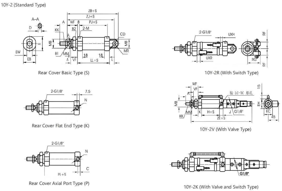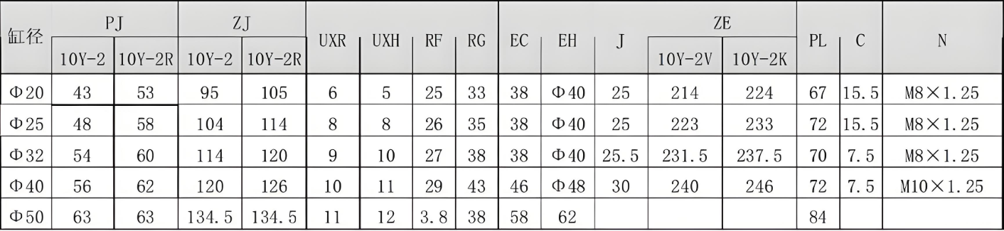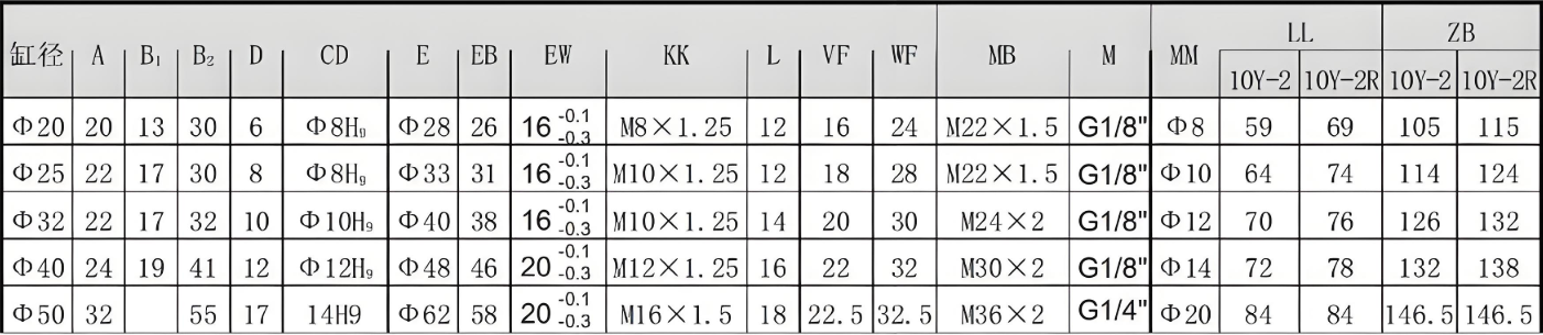 3.Please refer to the installation forms and rod end connection forms of the 10Y-1 series for the installation forms and rod end connection forms of 10Y-2 with Φ20~Φ50.
