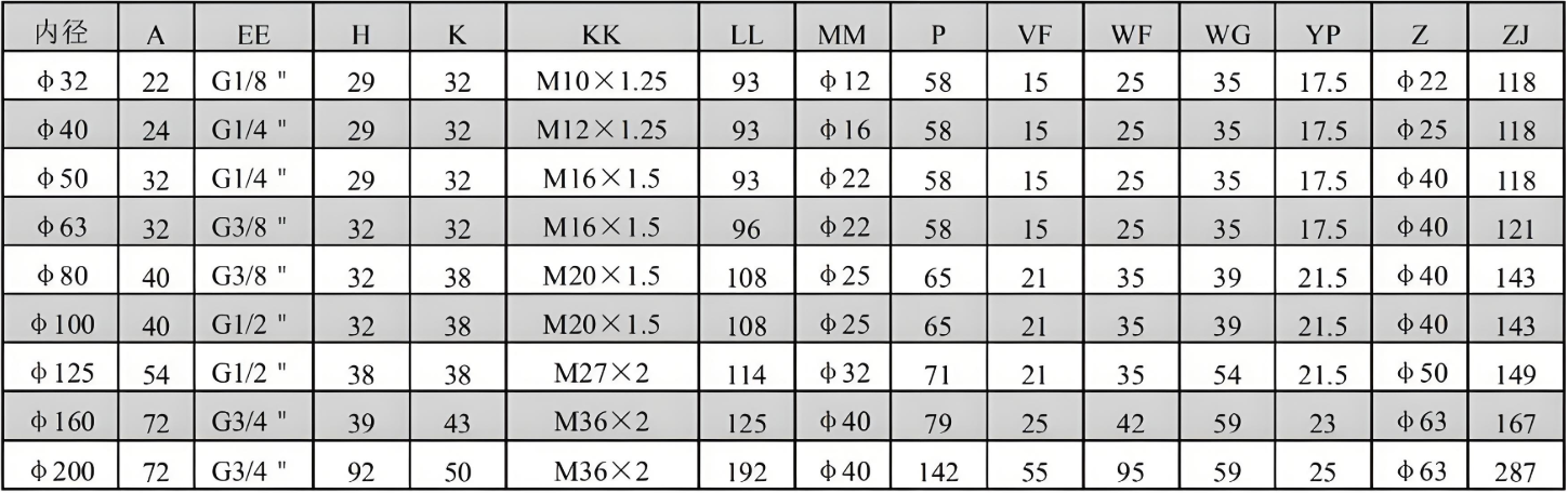 | Cylinder Bore Diameter D (mm) | φ32 | φ40 | φ50 | φ63 | φ80 | φ100 | φ125 | φ160 | φ200 |