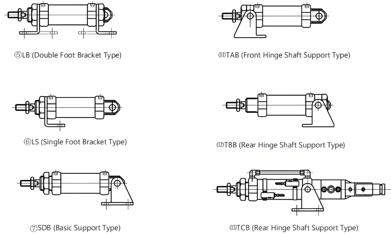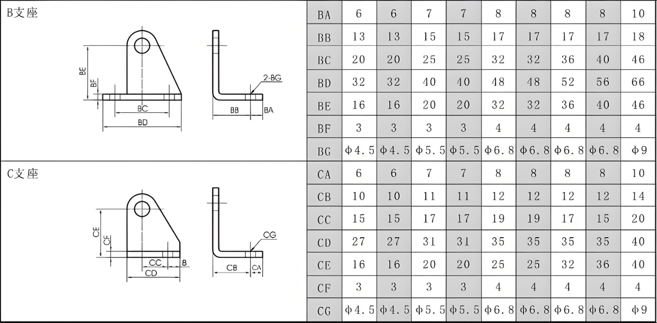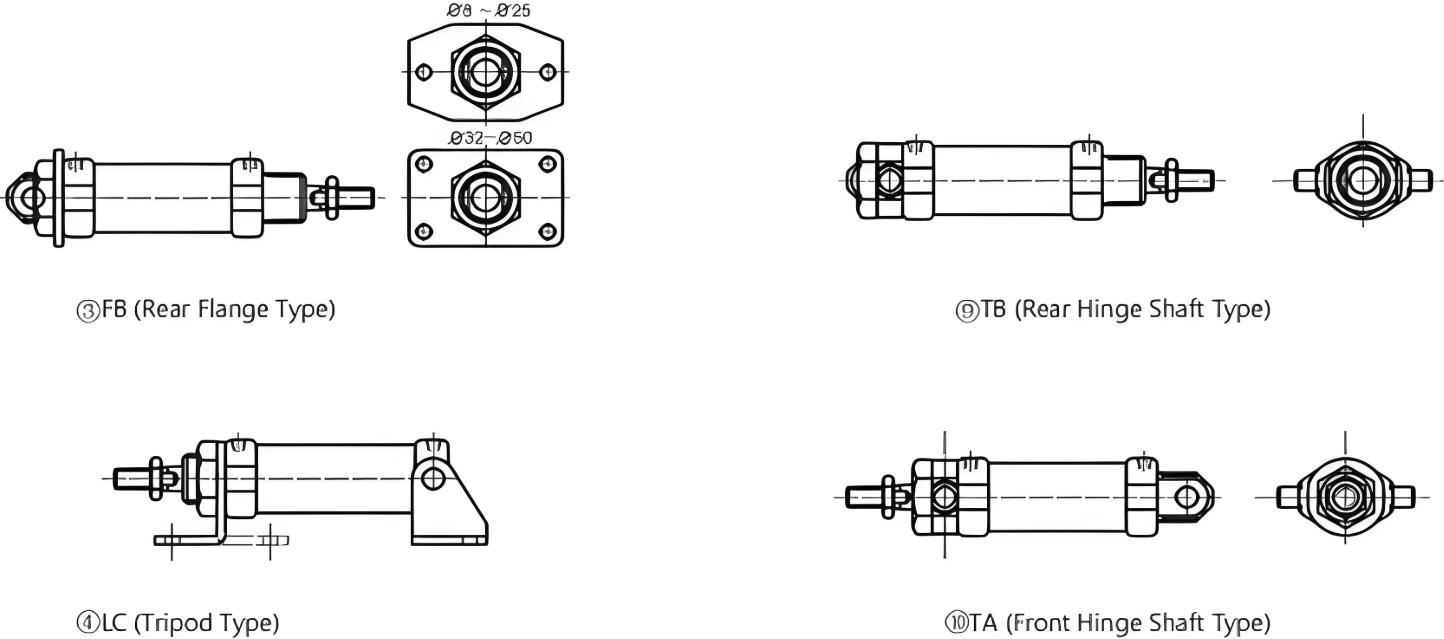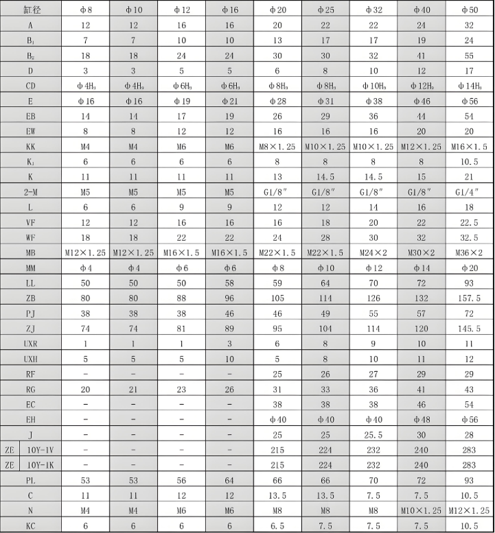 | Cylinder Bore(mm) | φ8,Φ10,Φ12,Φ16,Φ20,φ25,中32,Φ40,φ50 | 中20,Φ25,中32,中40,φ50 | ||