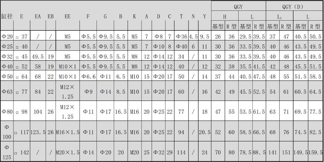 | Cylinder Bore (mm) | 20,25,32,40,50,63,80,100, 125 | 20 | 25 | 32 | 40 | 50 | 63 | 80 | 100 | φ125 | ||||