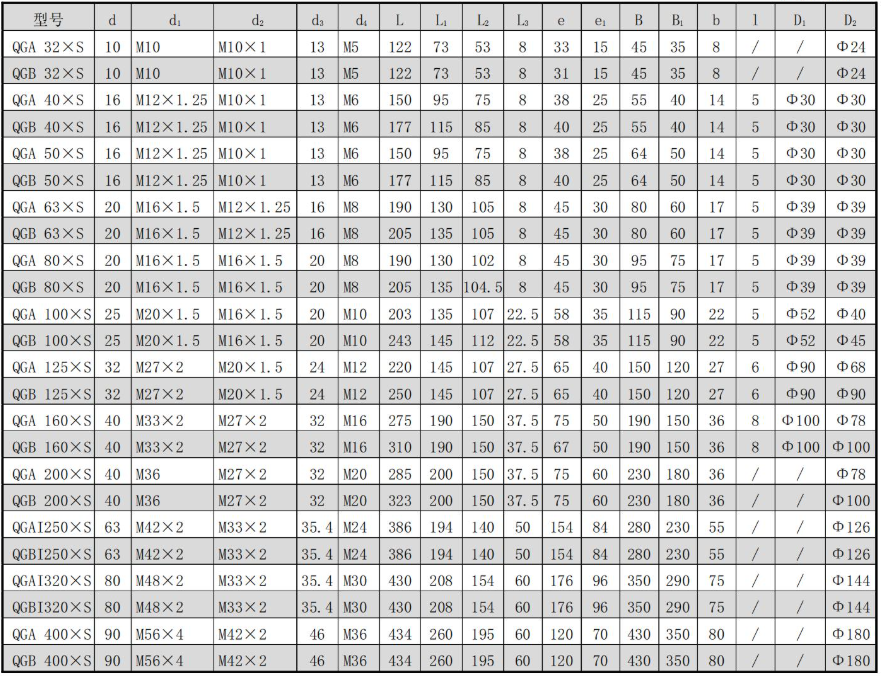 | Bore Diameter (mm) | 32 | 40 | 50 | 63 | 80 | 100 | 125 | 160 | 200 | 400 | 250 | 320 |