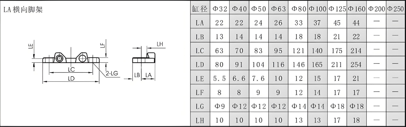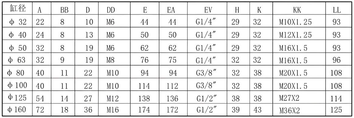 | Cylinder Bore Diameter (mm) | φ32 | φ40 | φ50 | φ63 | φ80 | φ100 | φ125 | φ160 |