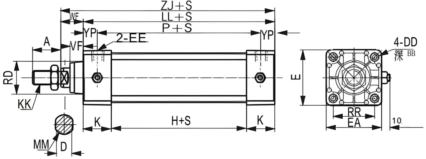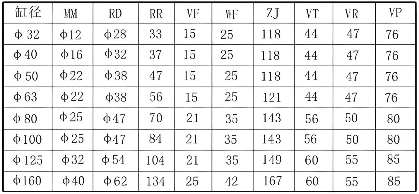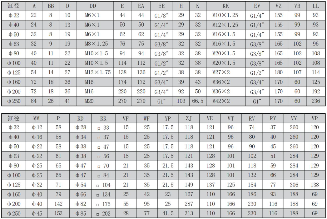 | Cylinder Bore D (mm) | Φ32 | ①40φ50 | Φ63 | Φ80 | Φ100 | Φ125 | Φ160 | Φ200 | Φ250 | Φ32 | Φ40 | Φ50 | Φ63 | Φ80 | Φ100 | Φ125 | Φ160 | Φ200 | |