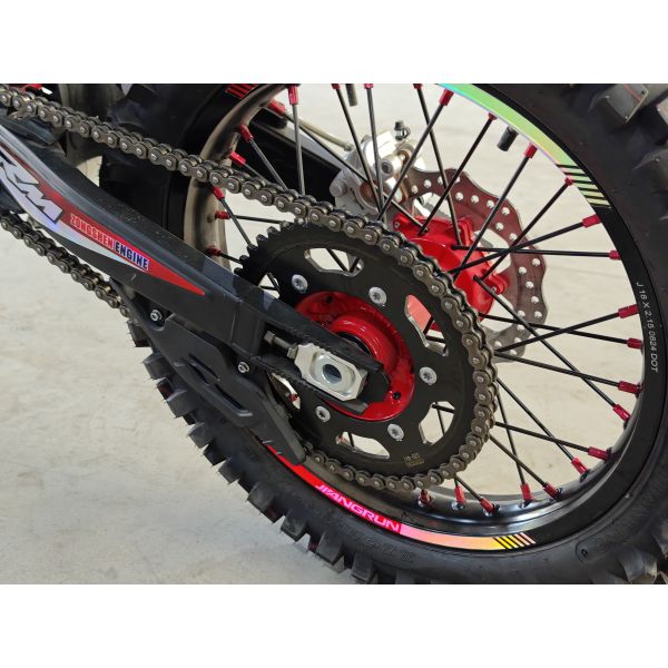 NC250 single cylinder, four-stroke, inclined, water-cooled, four-valve electric/foot start, water- cooled engine, competition board track carburetor, maintenance-free battery, track-style front and rear shock absorbers, with high-function cradle. Multi-function digital instrument, front and rear aluminum alloy lightweight mesh wheels, front wheel specifications 3.00-21, rear 4.60-18 deep tooth off-road tires, reinforced track board aluminum alloy flat fork, classic racing rearview mirror.