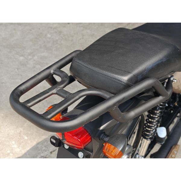 110 electric kick start engine, chain drive, 12V4-pole half-wave, manual clutch, round light, double round meter, painted handlebars, rear rack, front and rear fenders, painted bumper muffler with chrome guard, aluminum alloy wheels 1.2-17 front and 1.4-17 rear, front tires 2.25-17 rear tires 2.50-17, single horn, ordinary rearview mirror.