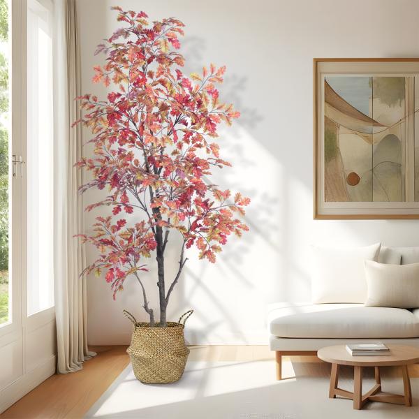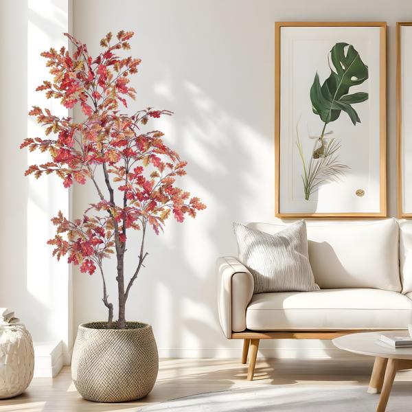 Stunning Autumn Colors Year-Round: This artificial oak tree features a beautiful blend of green, gold, orange, and burgundy leaves, perfectly capturing the warm and inviting essence of the autumn season without any leaf drop.