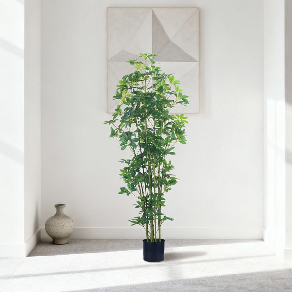 Lifelike Multi-Stem Schefflera: This artificial Schefflera plant features a realistic multi-trunk design and lush, glossy green leaves, perfectly mimicking the natural growth of a live Arboricola tree.
