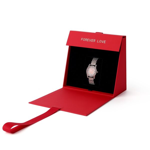 Celebrate eternal love with our Triangle Jewelry Box, an exquisite hand-held design that combines romantic elegance with practical functionality. This unique triangular box features the heartfelt messages printed in elegant script, creating an emotional connection perfect for Valentine's Day gifting. The sophisticated red exterior with contrasting white interior provides a classic romantic color scheme, while the satin ribbon handle adds both luxury and portability. Specifically designed with watch displays in mind, the interior includes a soft cushioning layer that securely holds timepieces or delicate jewelry while preventing scratches. The triangular shape offers structural stability and creates a distinctive presentation that stands out from conventional packaging. Ideal for storing watches, rings, or necklaces, this box serves as both protective storage and an elegant display piece that keeps your precious items organized while celebrating your special bond.